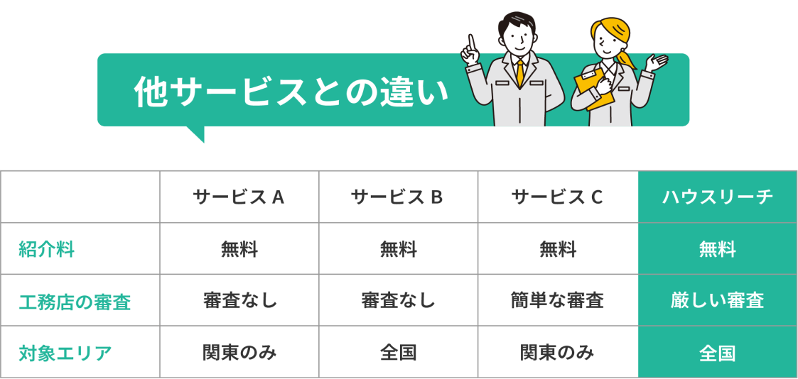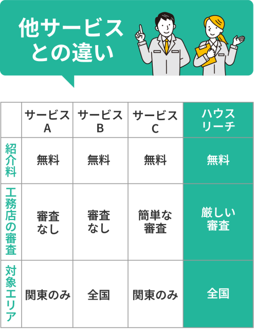 工務店の売上から5%を頂戴しておりますので、お客様からはいただきません。また、これによって工務店側も弊社のサービスを利用することで本来かかっていた営業費や販促費が抑えられるので、工事費が割高になることもございません。